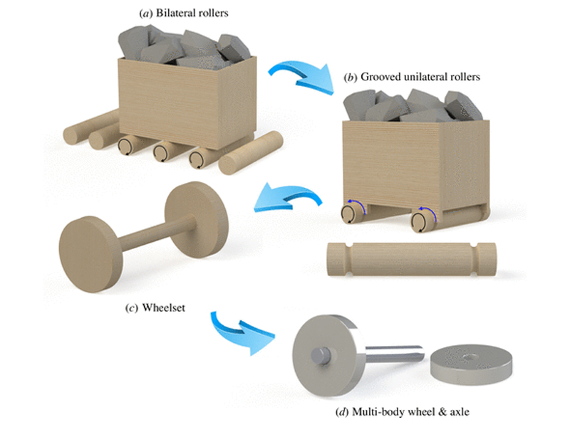 Спочатку це були примітивні вози з роликами, які допомагали переміщати вантажі по горизонтальних поверхнях. З часом конструкція удосконалювалася, і з’явилися перші колеса з осями. Хоча такі колеса були не ідеальними для поворотів, вони цілком задовольняли потреби шахтарів, оскільки шахтні проходи зазвичай були прямими.